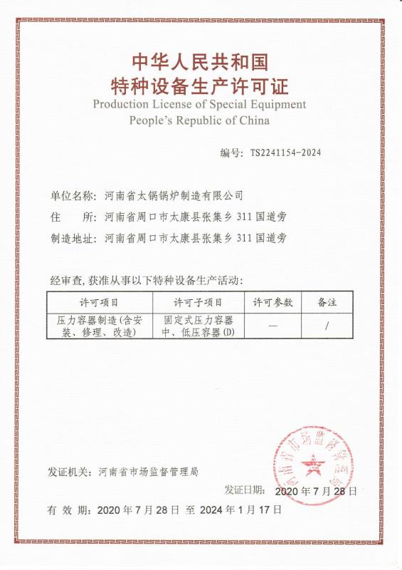 A級鍋爐制造許可證